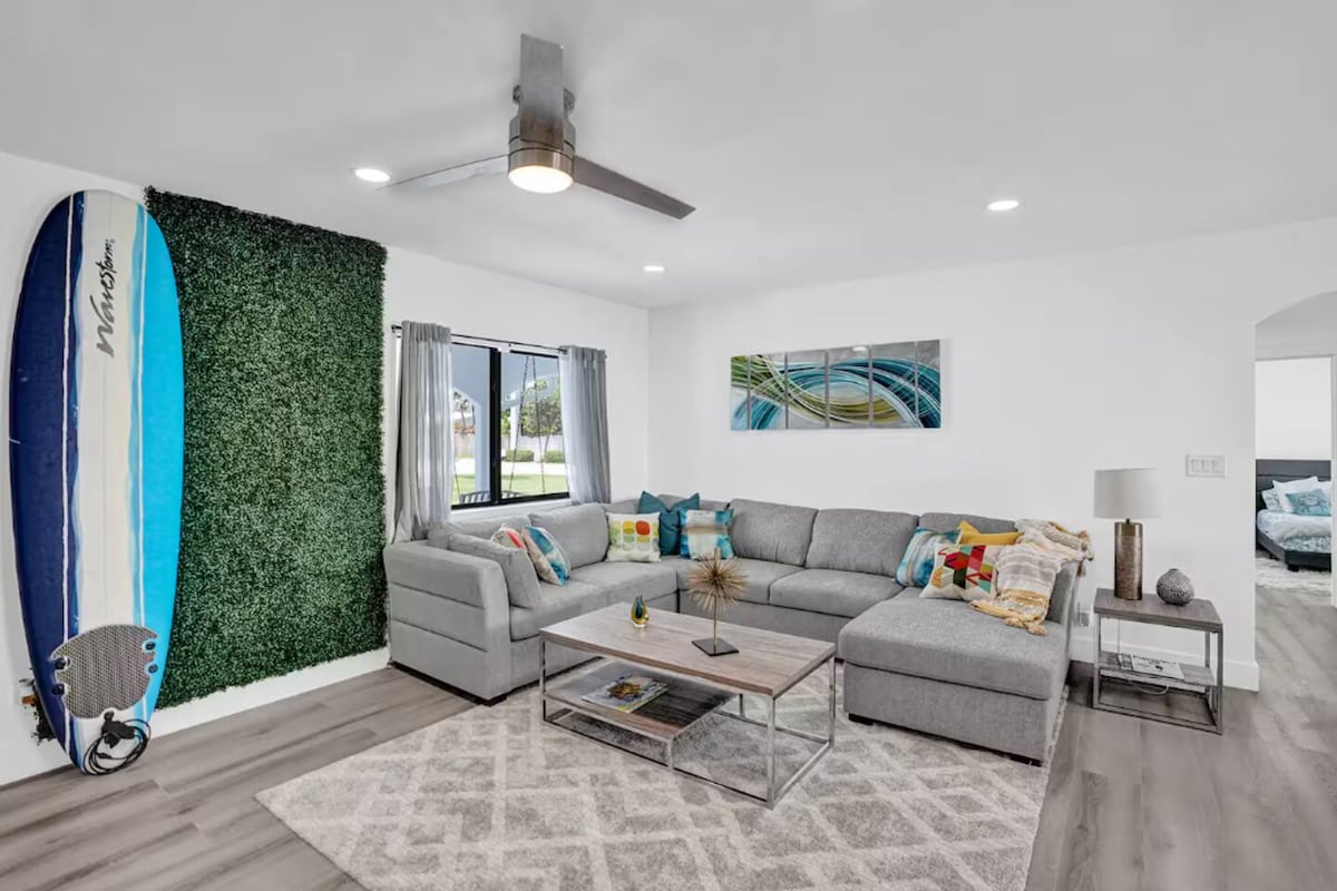 3 homes (200yds, 0.1 miles) from beach access! We are one of if not the closest home rental to the beach! Perfect for 2 couples - split floor plan with 2 queen beds (electric frames) with 2 full bathrooms + large 7 seater sectional. Every room has a 55-65in TV with Comcast, fast Wifi, HBOMax, Netflix, Hulu, AppleTV. Our house is close to everything! - Beach: 3 homes (on beach access rd) - Downtown: 0.3 miles away from restaurants/bars - Publix/CVS: 9 homes away