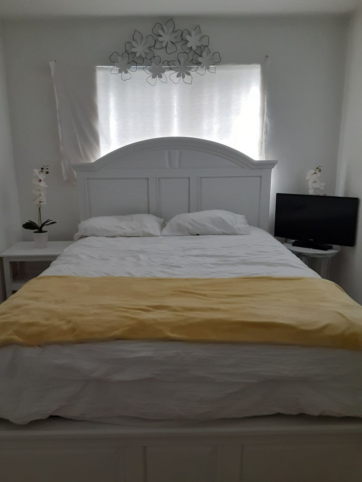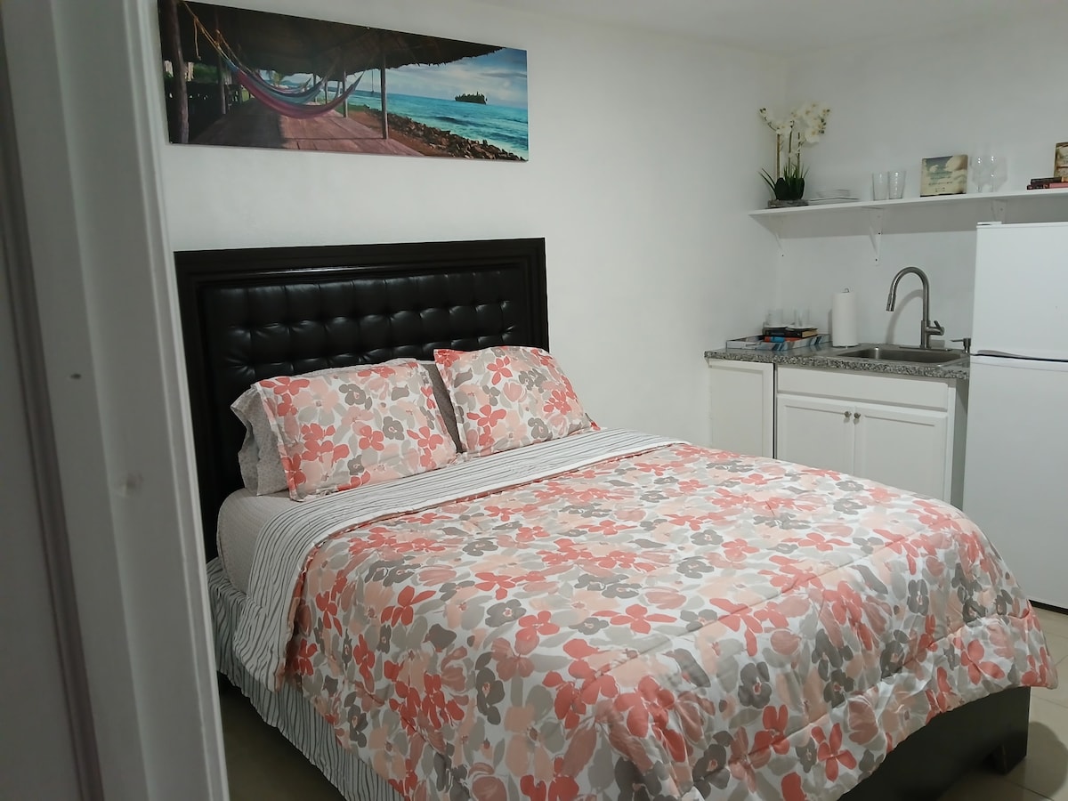 Luxurious Private Studio w/ Private Entrance (440 sq ft- can fit 3 people/2 cars) is attached to our home & 1.7 miles from beach & adjacent to Ft Lauderdale. Park under the covered carport. 1 Queen Bed (& 1 Queen Size-Blow Up Mattress), 1 Bath, Kitchenette, Fiber Optic Wifi, Flat Screen TV (140 channels), Impact Windows, Huge Closet, Fan/light, AC w/ remote, Desk, Chair, fold up/down Table for eating w/ chairs, small Fridge, Microwave, Toaster Oven, Foreman Grill, Hot Plate Stove, Coffee Maker.