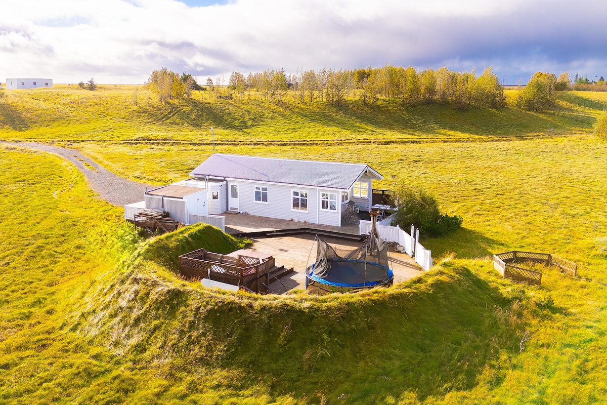 Amazing cottage with HOT TUB, warm interior and magical views. From the deck you can see HEKLA VOLCANO, the queen of Icelandic volcanoes. The cottage offers a Home-away-from-Home environment which is a traveler's dream. WINTER SERVICE: We take care of all our guests and we clear the snow from the road as often as necessary! Many other accommodations do not offer this service.