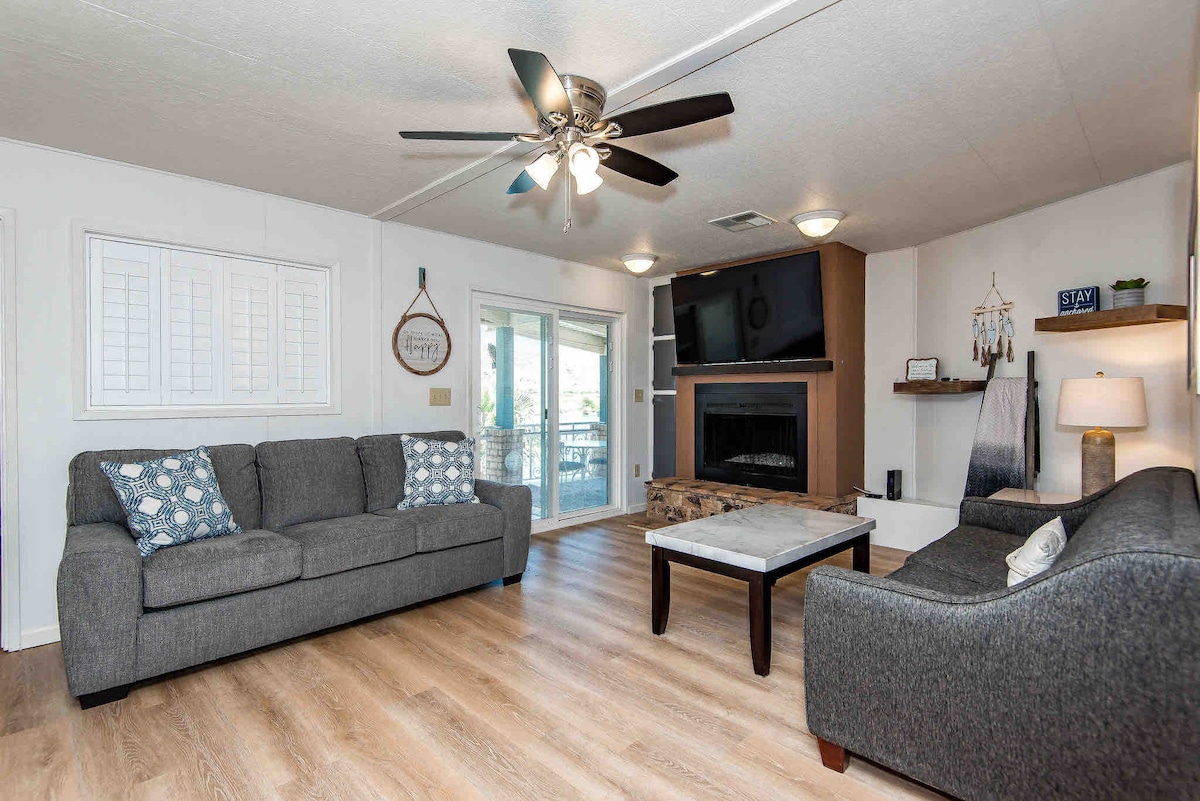 Welcome to The Bullhead Boho! A unique three bedroom home backed up to a tranquil green belt with lakes for fishing less than a quarter mile to the main highway or our private launch and beach. Nestled in Palo Verde Meadows, our home sleeps 8 completely comfortably with space for hanging out in the backyard, or playing shuffleboard or family dinner on the oversized vintage dining table.