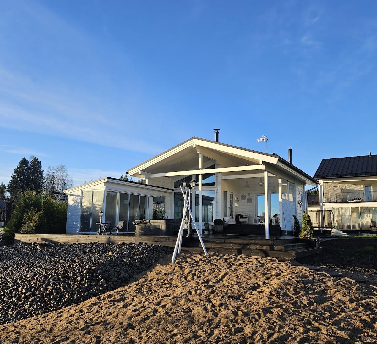 Spend a cozy Christmas by the lake, just 7 km from Jyväskylä city center! This spacious 220 m² home is perfect for families and travelers. Enjoy your own sandy beach, lakeside sauna, outdoor hot tub, and a fully equipped kitchen. With 5 bedrooms, 2 bathrooms, and a large living room, there’s plenty of space to relax together. Pets are also welcome.