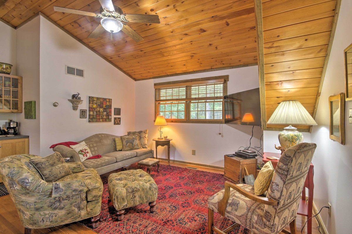 Set about a quarter mile off the road, our pet friendly solar powered vacation cottage is a perfect getaway for anyone trying to spend some alone time with nature! Guests have complete privacy inside the cottage with a full kitchen, two TV's, Wi-Fi, and a mini split system for heating and cooling. As well as exclusive access to the hot tub, fire pit and pond outside! We also have various shared hiking trails through the woods surrounding the cottage for campers and cottage guests to enjoy!