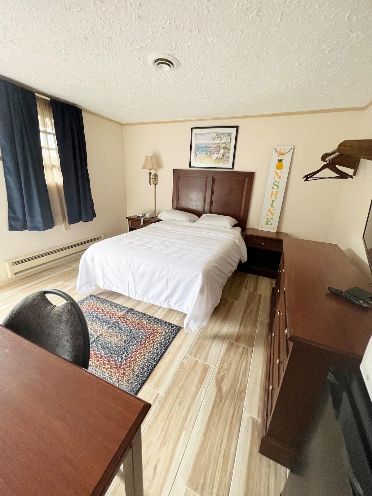 This is a large room with king bed, spacious bath with walk in shower, and private in room hot tub. This room comes with free WiFi and a refrigerator and microwave. We have convenient on site parking and are located right on Rt 51 for an easy trip into Pittsburgh for sporting events, shows and dining out. We have a staffed front desk 24/7 to help with any thing you might need. This room does have a flight of steps from the parking lot to the private entrance.