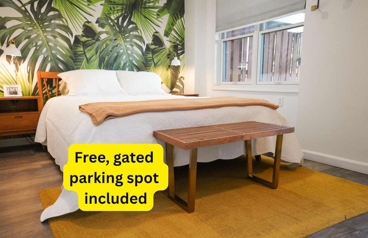 Unit #2. We have a fun, modern decor that showcases a love of our pet friendly home! One parking spot. There are two bedrooms: the primary and a second bedroom room (that we use as a dressing room) both are small rooms with deluxe memory foam Murphy beds - both with attached full bathrooms. Special note: this is our full-time home. We live here and our personal things remain here throughout your stay. Please think of yourself as close friends who have come for a visit - we’ll do the same!