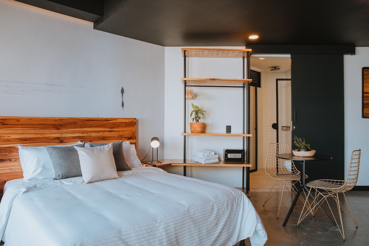 3450 Living is easy to spot among the trees in Laureles. Designed like the bow of a ship, the angular combination of glass, brick, black metal, and concrete is conveniently located. The relaxed atmosphere is perfect for young professionals, students, couples, digital nomads, or friends looking for a cost-effective space in a prime location. Four floors of modern-chic apartments feature expansive valley views from the balconies, residents also have access to the rooftop social area with jacuzzi.