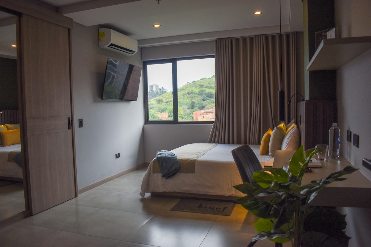 - Loft acondicionado para personas con mobilidad reducida. - 37 m2, - Vista a la ciudad - Nevera - Cama King size, televisor por cable, - Escritorio de trabajo, closet, caja fuerte, - Aire acondicionado, - baño privado que incluye toallas - implementos de aseo y agua caliente. - NO TIENE COCINA.