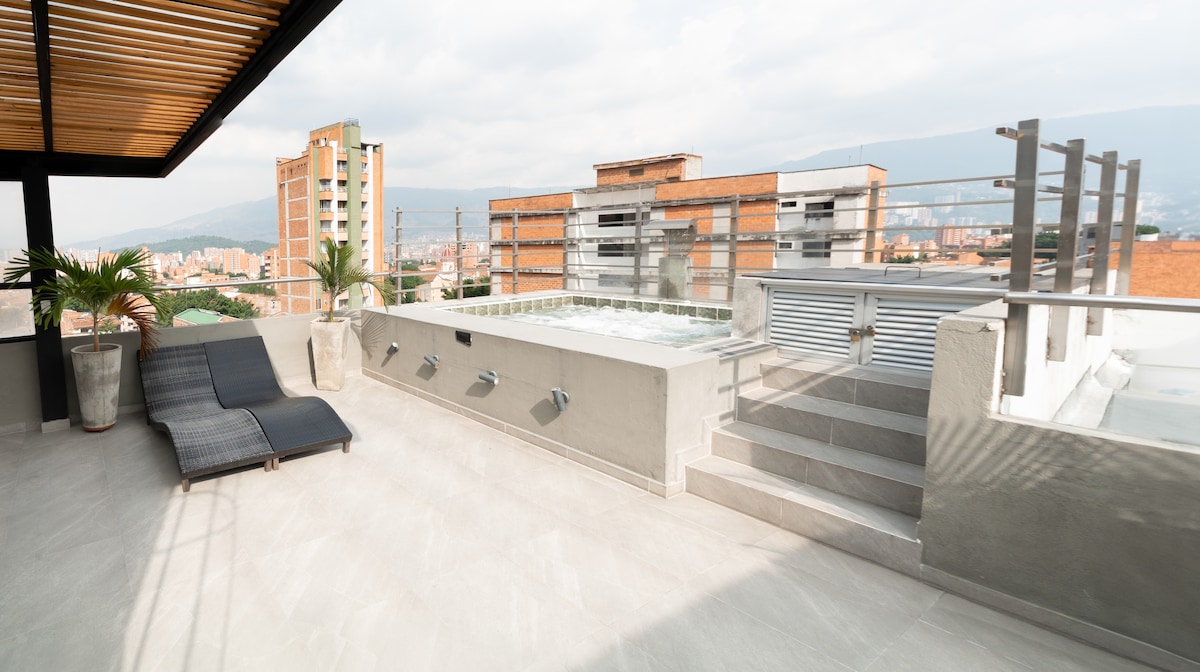 Loft 43 Medellin Exclusivo Penthouse en Laureles con terraza y jacuzzi para quienes buscan exclusividad y experiencias únicas, recepción 24 horas. Cuenta con 3 alcobas, aire acondicionado, camas Queen Size, 4 baños, terraza cubierta, Jacuzzi, asoleadoras y hamaca. Elementos básicos de cocina puedes solicitarlos en recepción, Aceite, vinagre Sal y pimienta puedes comprarlo en en una tienda cercana. Para registrarse es necesario presentar un documento de identificación fisico válido.