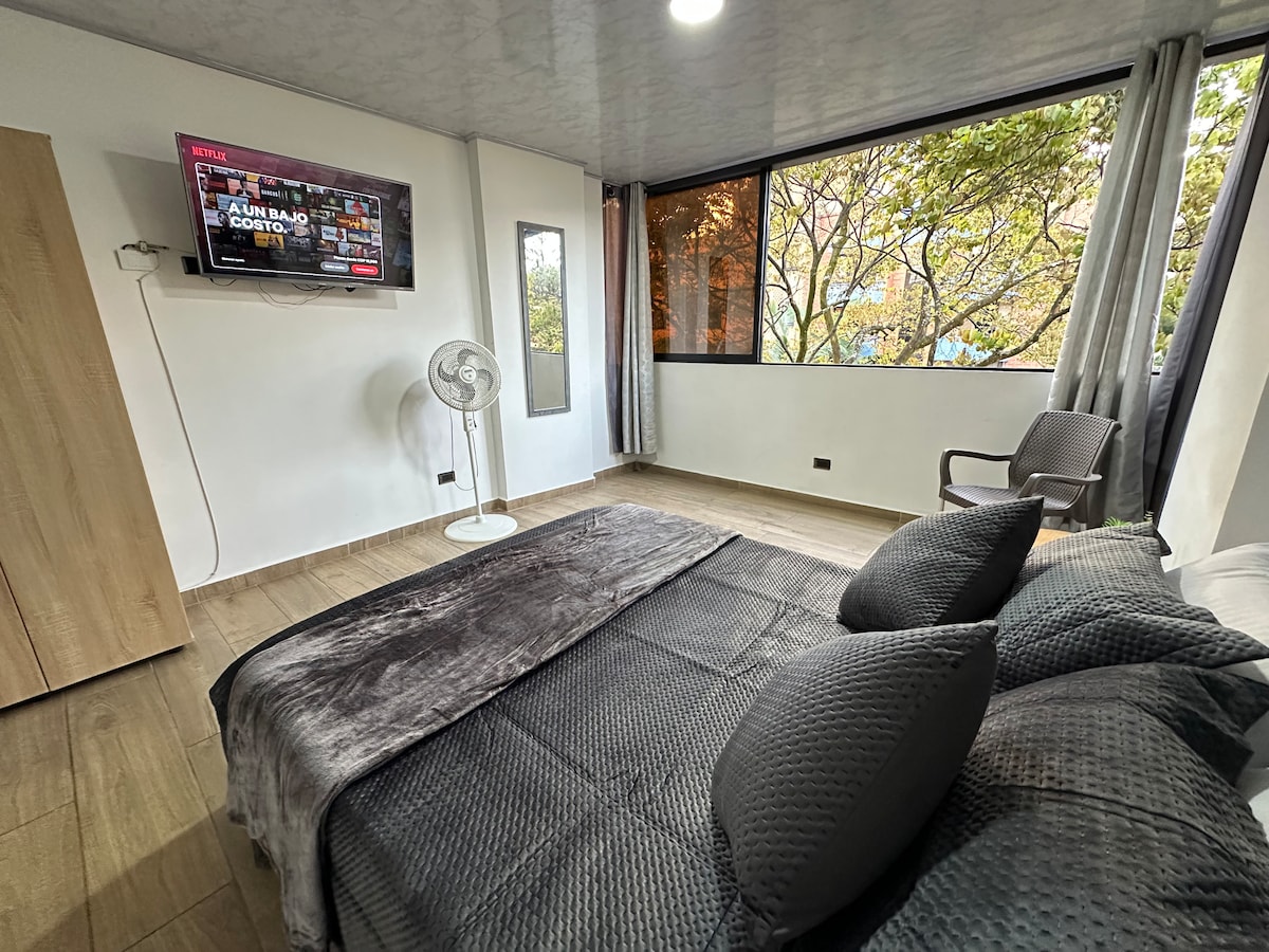 Hermoso aparta estudio en el sector del Estadio, excelente ubicación, ingreso independiente. Con espacio para trabajar (opcional), estacionamiento externo, se aceptan mascotas, cerca a estación del Metro, excelentes vías de acceso, capacidad para dos personas y una adicional, una cama Queen, un sofá-cama, baño con ducha; cocina integral a gas, vajilla y utensilios, nevera y microondas. Televisión, internet de 560 Megas (Varía según dispositivo), lavadora, patio de ropas.