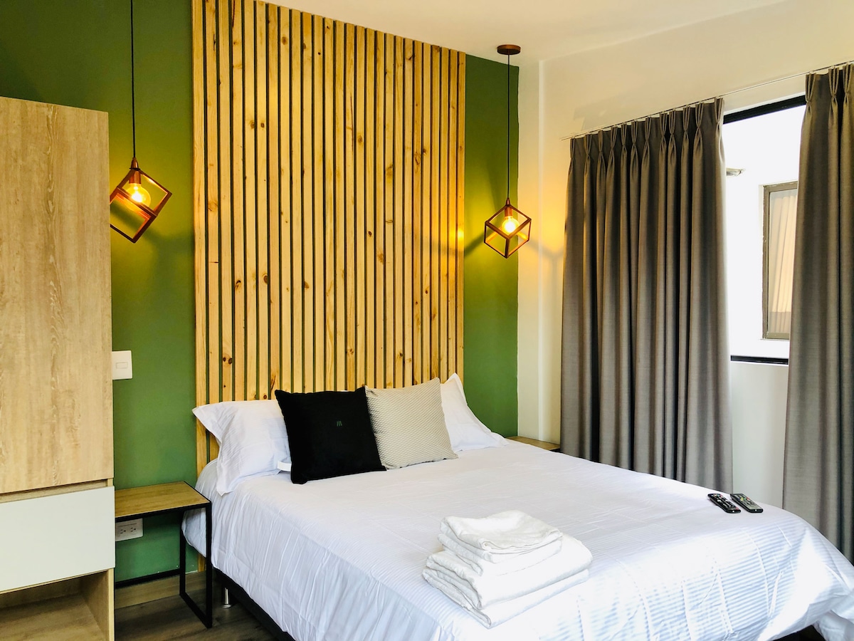 *Conexión WIFI. *Cama tamaño King *Aire acondicionado *Cocina integral dotada *Baño privado con agua caliente *Televisión smartv de 43 pulgadas * Zona de lavandería (piso 2 del edificio, cada huésped debe pagar por usarla y llevar su jabón) *Las fotos de la vista, son de referencia, no se asegura ningún piso especifico. * Utensilios de cocina como aceite, pimienta, sal, debe comprarlos cada huésped. * Caja fuerte