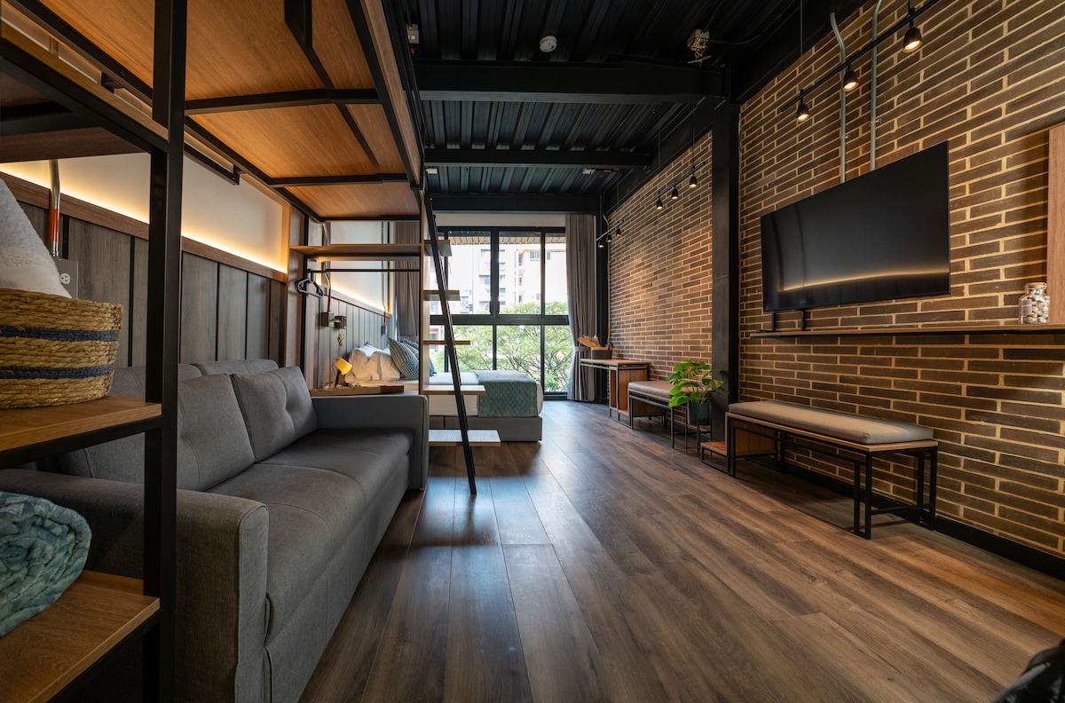 3450 Living is easy to spot among the trees in Laureles. Designed like the bow of a ship, the angular combination of glass, brick, black metal, and concrete is conveniently located. The relaxed atmosphere is perfect for young professionals, students, couples, digital nomads, or friends looking for a cost-effective space in a prime location. Four floors of modern-chic apartments feature expansive valley views from the balconies, residents also have access to the rooftop social area with jacuzzi.