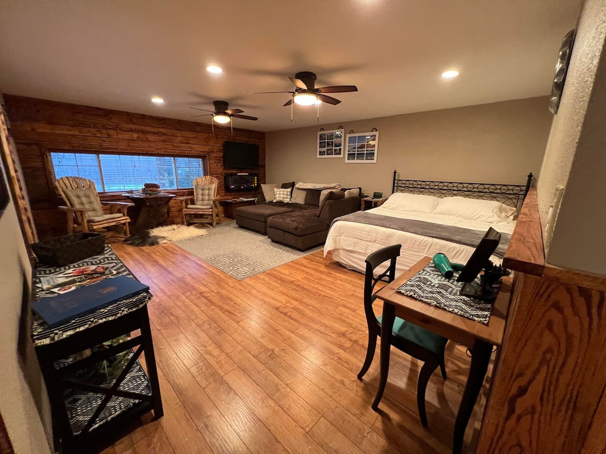 Large private 2nd floor studio style living area with queen size bed, couch, table/chairs, TV, refrigerator, microwave, hot plate, NO OVEN OR STOVE TOP, sink, large shower, A/C, heat, washer and dryer, and deck. Wifi internet is provided. The television has Netflix. No cable channels. The furnace is nontraditional. It is not located in a closet. The noise when running and starting will be louder than normal during winter months. Ear plugs are available for those that are noise sensitive.
