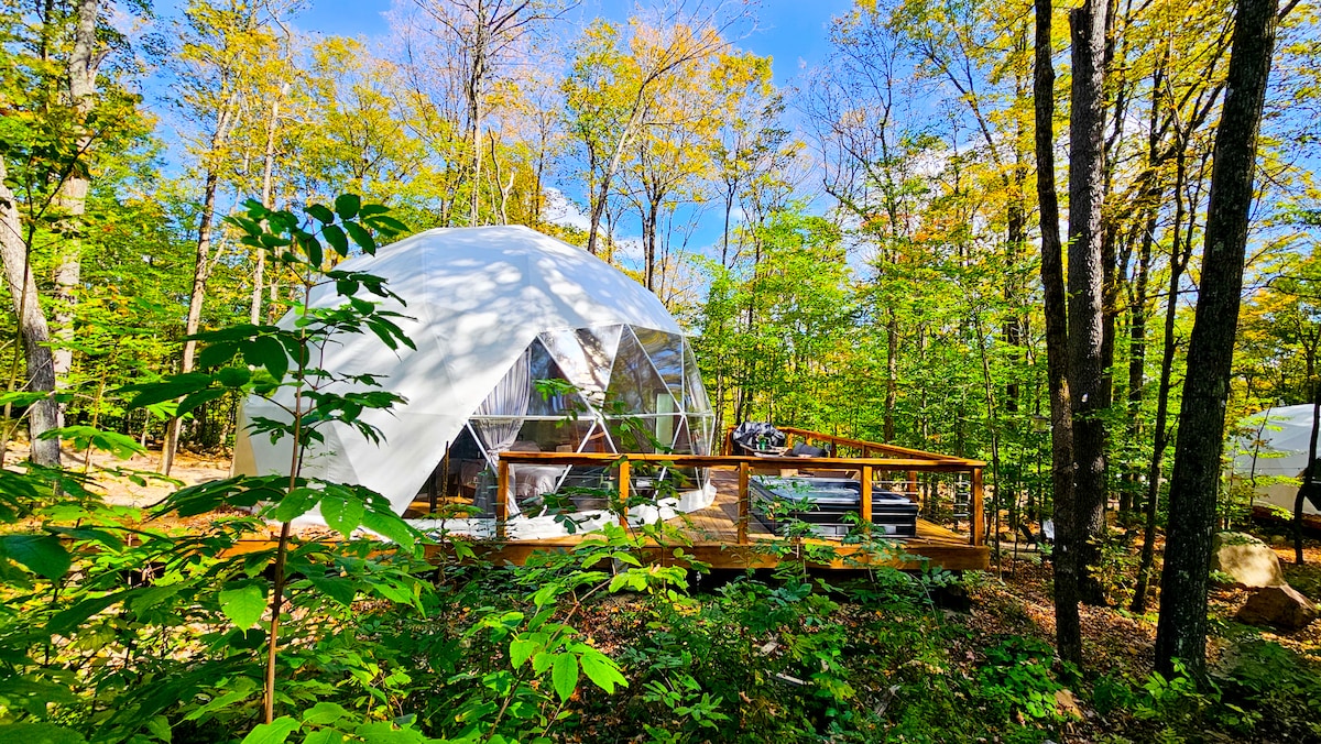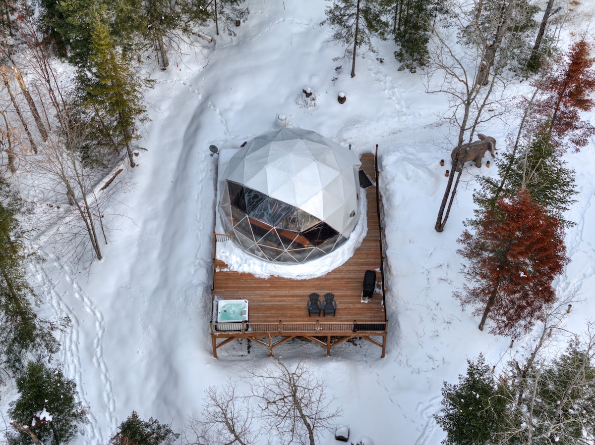 Visit our Airbnb profile to see the listings of our 6 private domes :) Welcome to Gîte l'Évasion! Experience sleeping under the stars in the comfort of a king bed, in the wonderful Lake Superior region. ✲ 25 minutes to Tremblant ✲ Private 4-season spa ✲ Indoor Gas Fireplace ✲ Fire pit ✲ Private terrace with BBQ ✲ Footpath ✲ Private shower ✲ Full kitchen ✲ AC ✲ Included: Bedding, towels, sanitary