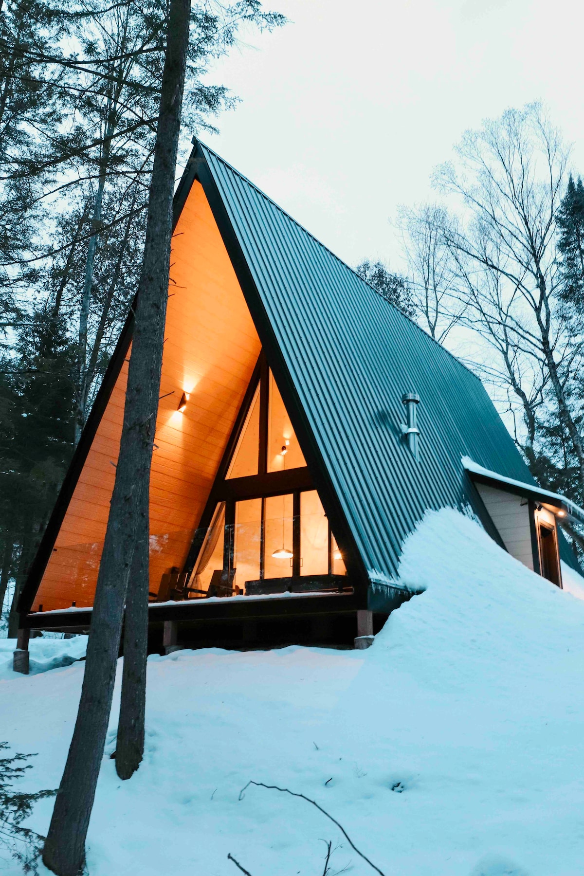 Our Nordic forest chalet is perfect for spending quality time as a couple (or with a kid), or for a work-retreat (with high-speed WiFi). The wooden interior is warm and cozy. The full-height windows offer stunning views over a forested valley. The open-concept kitchen and living room keep you in the conversation while cooking. If you prefer to cook outside, there is a fire pit with a grill and outdoor dining table. Only 70-min drive from Montreal. The lake is a 25-min walk if you park nearby.