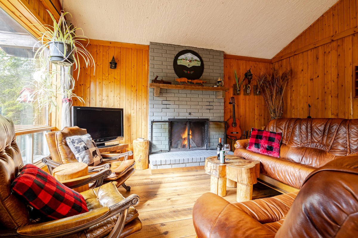 A calm lake chalet in wood, between two regional parks, minutes walk from nature trials and off the beaten path. East windows let the happy morning light on natural materials and heated floors. In the evening, a cozy cinema with ambient sound by a fireplace, a second media room with a turntable ideal for music. Outdoors, a hot tub, a wood-burning sauna, a fireplace by the lake and a slide. Cross-country ski, snowshoe trails are minutes’ walk, and snowmobile routes start right at the driveway.