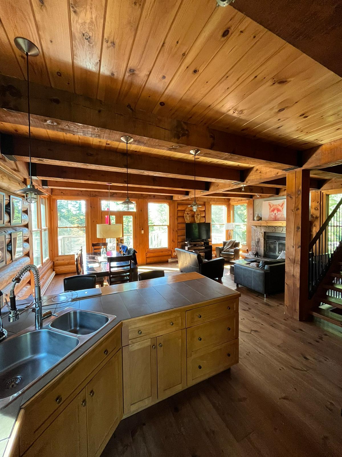 Chalet de bois rond dans le magnifique domaine de Fraternité sur le lac. Grande terrasse avec Spa et BBQ. À moins de 10 minutes du versant Nord Tremblant pour le ski. Accès exclusif au Club de la Pointe et au lac: embarcations nautiques, tennis, volleyball, badminton, salle de jeux, gym et l'été à la piscine extérieure. Chalet confortable avec 1700pc sur 2 étages avec 3 chambres et chacune leur salle-de-bain privée, laveuse/sécheuse et cuisine bien équipée. Pour les amoureux du plein air!