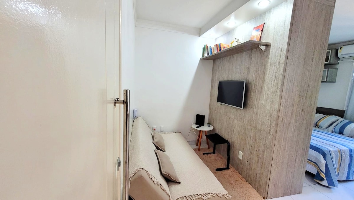 Sea view apartment in condo right next to the beach. Ideal for relaxing with friends, family or by yourself. Bedroom with air conditioner; Wide bathroom; Sofa bed and Dining table in the living room; airy balcony; integrated kitchen with blender, cookware and tableware. Wi-fi available (Internet fiber 30 Mega) - Great for home-office workers. Best location in Vilas: By the beach, a 8 km from the Airport SSA and 5 km from the center of Lauro de Freitas.