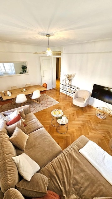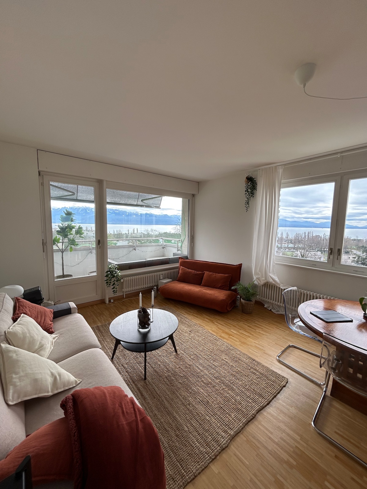 Appartement central à quelques centaines de mètres du lac, des commerces et des transports, au dernier étage récemment rénové, décoré avec goût dans un style classique et chaleureux + parking souterrain. En plus de la chambre avec le grand lit double Queen Size, le canapé du séjour est convertible et peut accueillir 2 adultes.