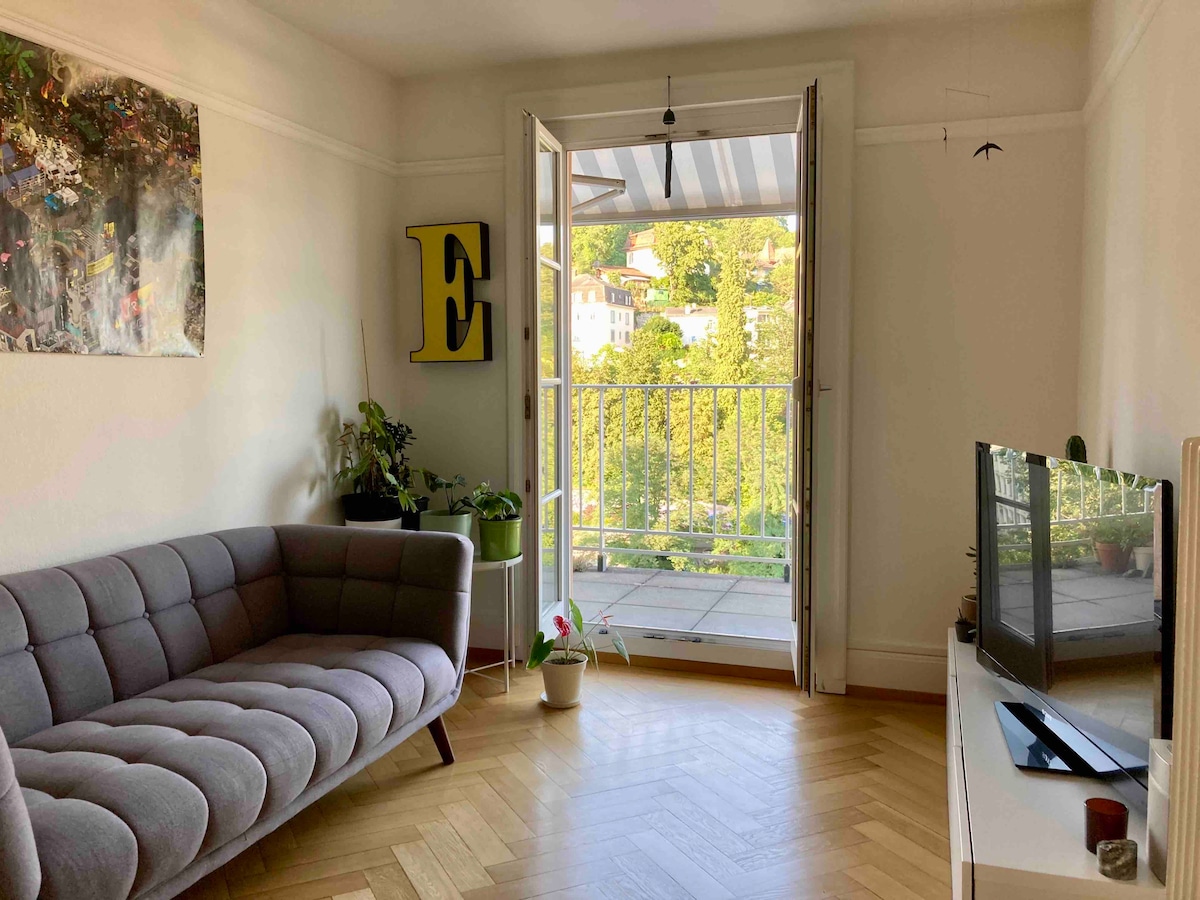 Beautiful apartment in the city center, close to transport , shops, CHUV hospital and metro l'Ours (2 minutes by walk). Terrace with a magnificent view of the city , the cathedral and the lake. The apartament has a bedroom with a king size bed , a sofa and a sofa bed for one person in the living room , a bathroom with bathtub , a kitchen and an amazing terrace. Free tea and coffee available . Garage Parking indoor disponible dans le bâtiment (15.- per day)