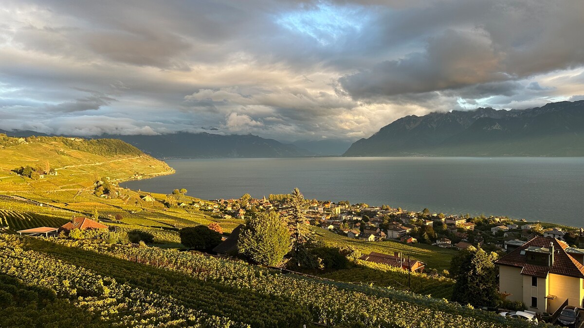 Un lieu privilégié avec vue 180 degrés sur les vignes, lac et montagne Appartement neuf, grande terrasse surplombant le lac, Beaucoup de cachet, vieux bois, pierres naturelles, douche italienne, sèche cheveux, cuisinette, avec évier, frigo, bouilloire, thé, café, micro-ondes, four, 1 plaque électrique, deux casseroles , assiettes etc... Coffre-fort, TV led etc... Mini bar, vins de la région ! Transports publics (train) gratuit de Lausanne à Montreux ! Parc privé et gratuit devant la maison!