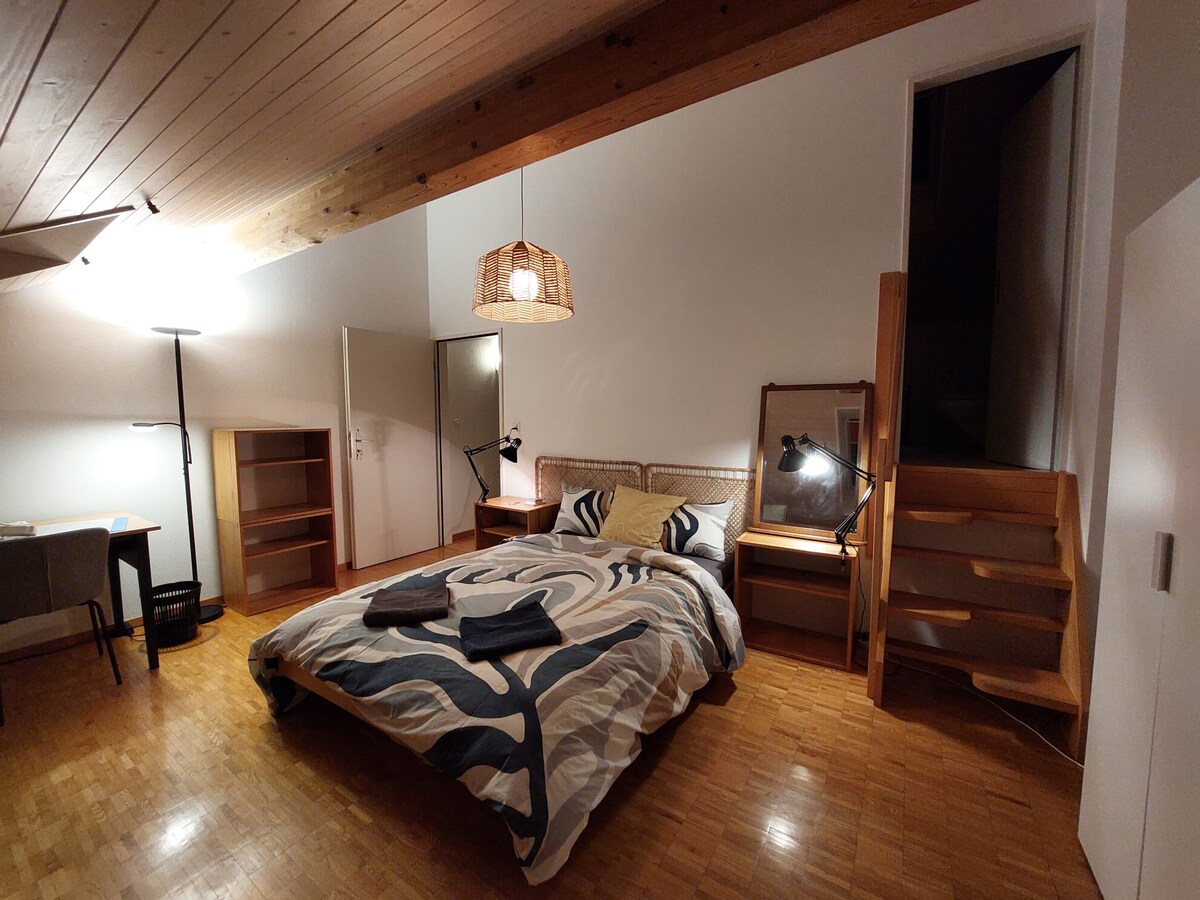 Townhouse in Quiet residential area close to EPFL and University of Lausanne. Guest room on first floor of 4 floors. Common area on ground floor, laundry room in basement, master bedroom on last floor, garden in front and back with small vegetable patch. Guest parking available. Public transport 1mnt walking distance and other amenities within 5mnts walking distance. Ultra-fast internet, Wifi 7, 10Gbps