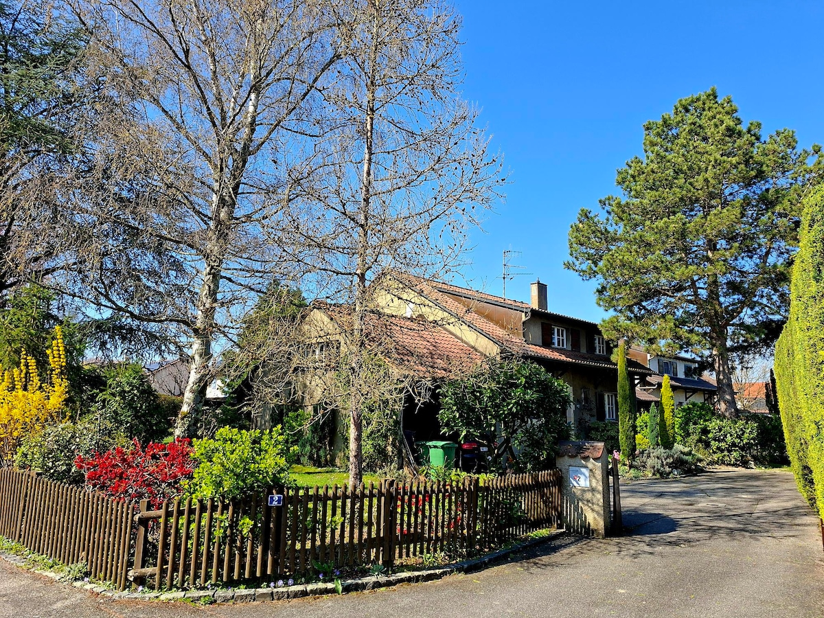 Vous profiterez d’une villa dans un écrin de verdure au centre-ville de Genève. Idéal pour voyageurs, famille, groupe jusqu'à 6 personne. Lit bébé à disposition. Vous serez proches des commerces, transports en commune et parcs. Le lac et la plage sont à 6 min. Vous pourrez faire des randonnée et skier aussi bien dans le Jura que dans les Alpes. Station les plus proches à 16 km.