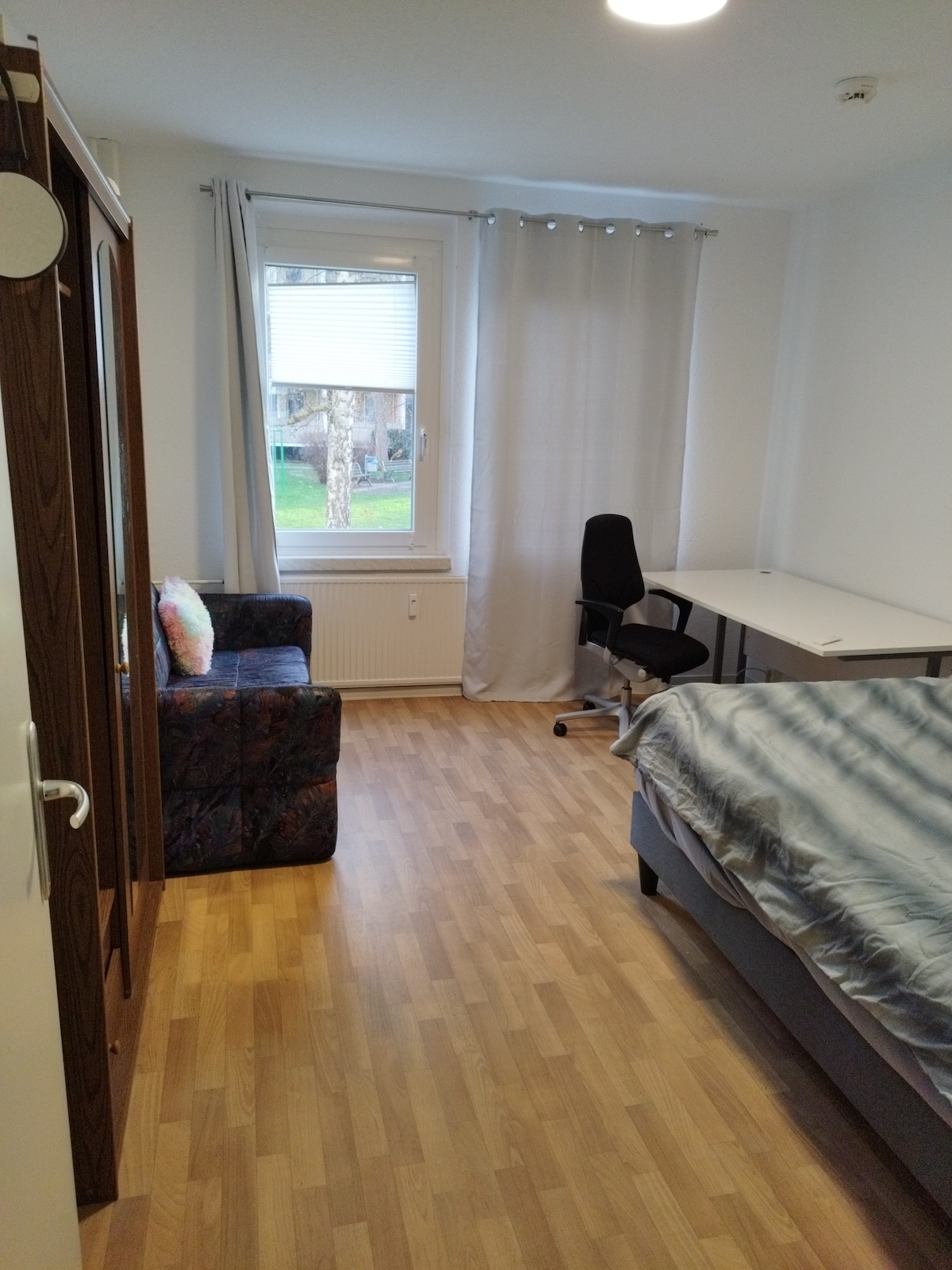 Apartment with a nice view from the 4th floor of a wilhelminian historic building just across a small park, 12 walking minutes from the Old City Centre, 500m from the trainstation and 300m from the Elbe River. The interior is nordic-elegant, with a small bedroom, living room with Couch (could sleep 2 more persons), small balcony, modern and fully equipped kitchen, bathroom with shower and a small corridor. The view from the apartment rewards the long stairs up to the 4th floor.
