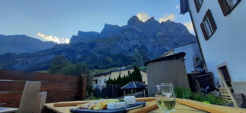 Penthouse studio with 100m2 terrace, uninterrupted views of the Alps and PRIVATE hot tub. Indoor space composed of an open living and dining room with a folding murphy bed (180cm), large screen TV, full bathroom and a cozy office. The kitchen has everything you need. Outside, the terrace and views await. An outdoor dining table, hammock and fire bowl invite you to relax. Close access to Gemmi & Torrant cable cars and thermal baths.