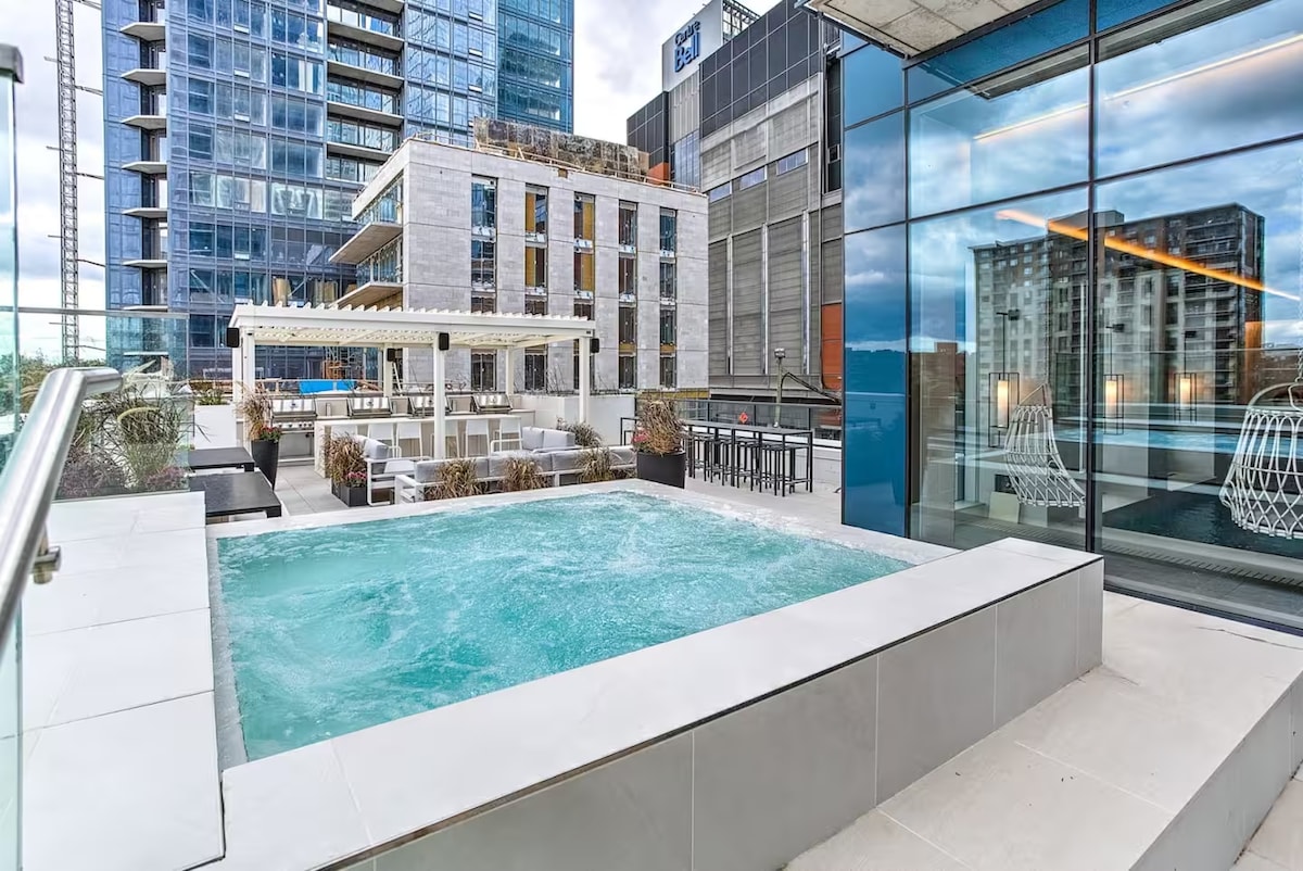 Experience a rare blend of ultimate convenience and private luxury. This modern 1-bedroom condo is your personal oasis, perfect for a relaxing getaway, a productive business trip, or a high-end home base. Its standout features are a private, all-season hot tub—one of the only in the area—and its unbeatable location just 15 minutes from YUL Airport. Every detail of this condo has been thoughtfully designed with a modern, elegant, and luxurious touch.