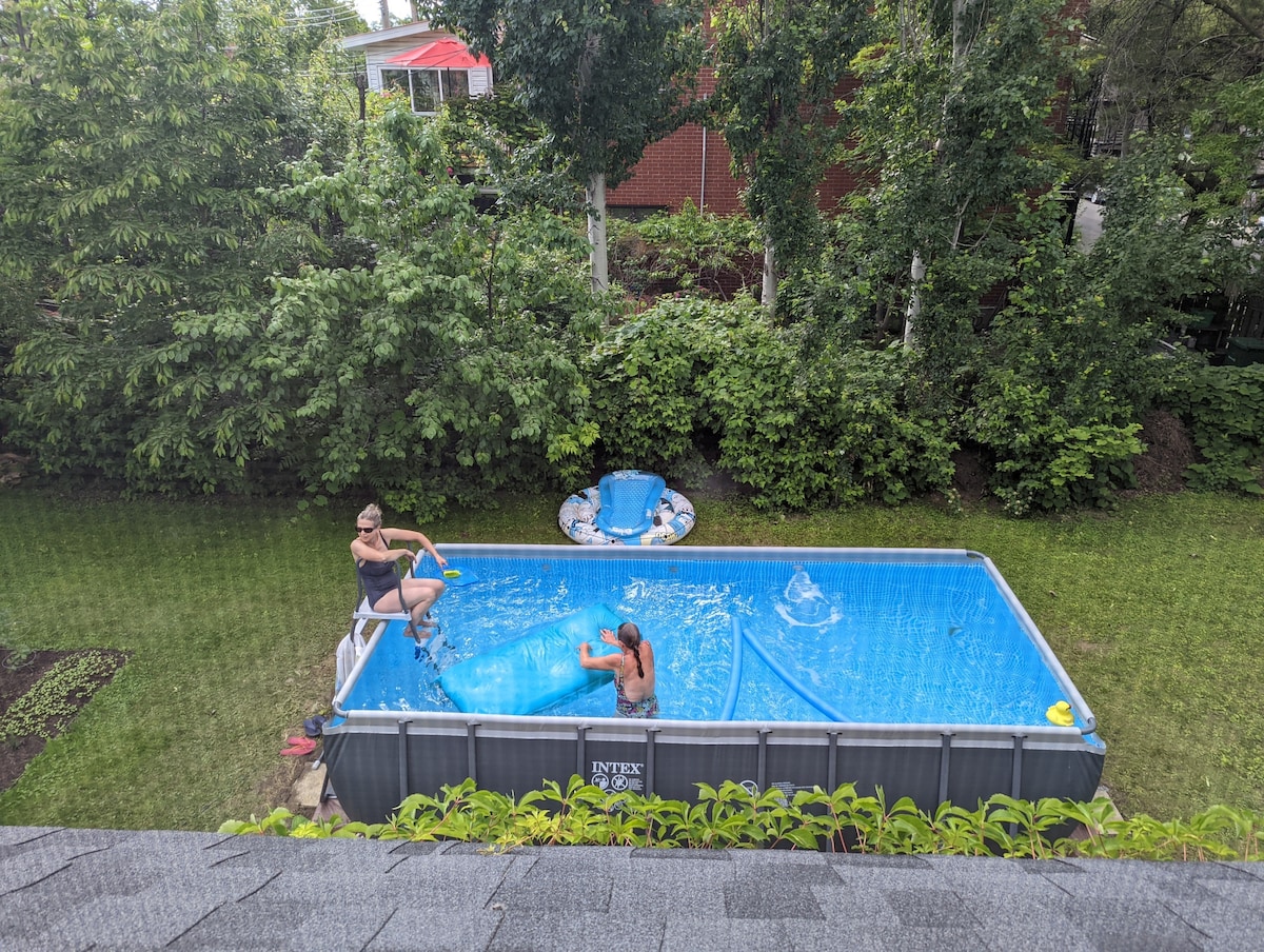 /!\ May-June: pool and parts of the deck will not be available for a few days due to renovations /!\ Independent suite with kitchenette, bathroom, and office nook. Located on the ground floor of our house in a quiet and safe residential area. Bright accommodation with a view of the backyard garden. Outdoor spaces and amenities (pool, patio, BBQ) shared with the homeowners. Free and secure street parking in front of the house. Montreal is 25 minutes by car and 40 minutes by public transit.