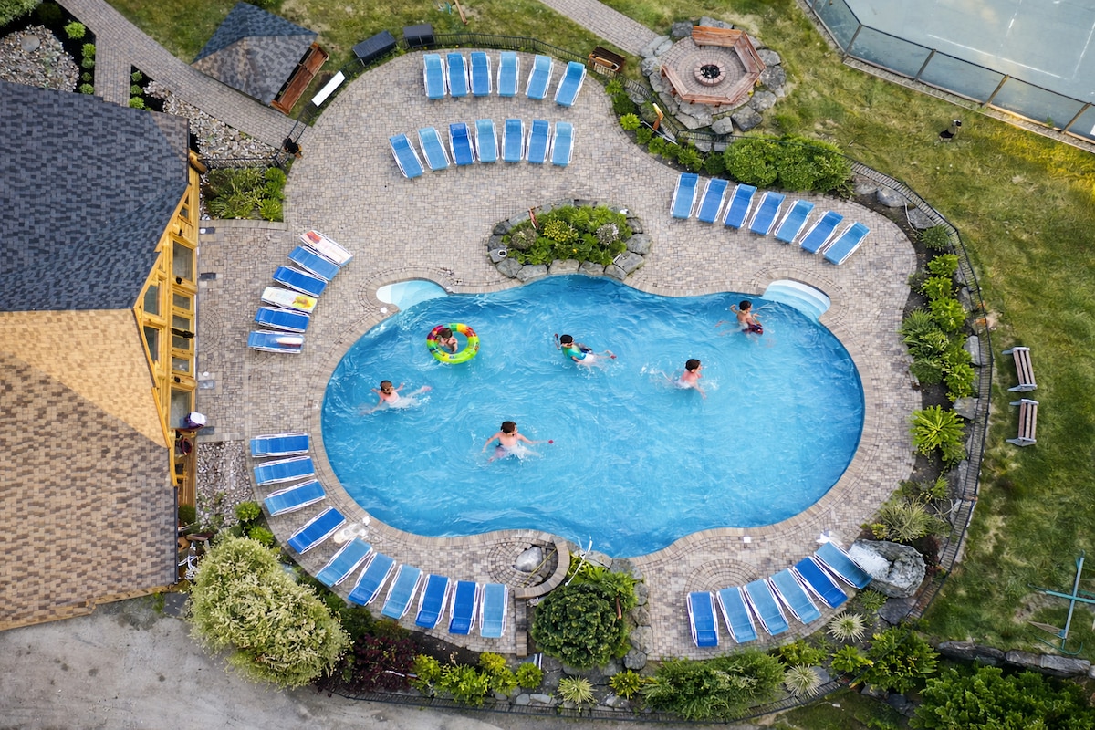 Close to skiing! 20mins from St Sauveur, 10mins from Morin Heights. Enough space for two families and lots of fun for everyone! 4 bedrooms , each with an ensuite full bathroom, pool table, poker table and bar area. Great outdoor space with a private above-ground pool, spa and sauna, large deck with outdoor dining and BBQ. Guests also have access to Fiddler Lake's amenities: lake, indoor & outdoor pools, skating, tennis, playground, basketball & more! (Available seasonally)