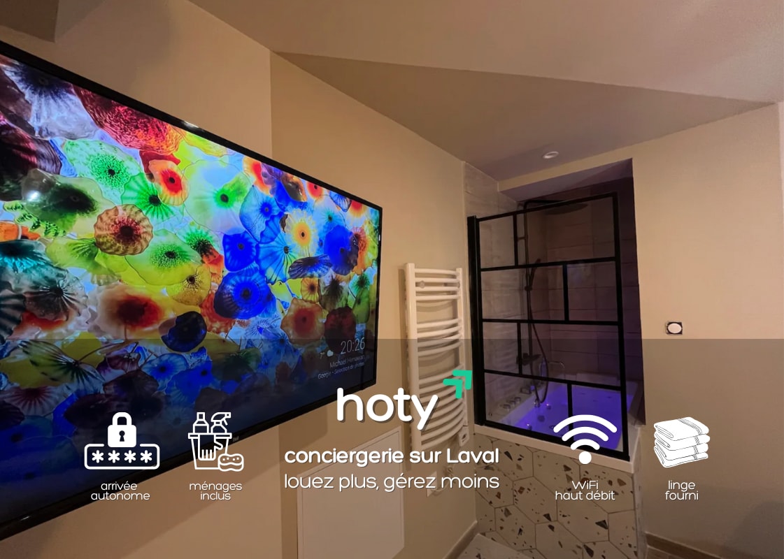 Situé en plein cœur du centre ville de Laval à 15mn à pieds de la gare et à deux pas des restaurants et bars du centre ville, cette suite sensuelle dédiée aux amoureux vous attend pour un séjour inoubliable en toute discrétion. Ce studio de plain pied de 40m² est entièrement équipé, tv, internet, wifi, cuisine avec évier, four, micro ondes, plaques, frigo et ustensiles de cuisine pour cuisiner en toute autonomie. Détendez vous dans votre jacuzzi privatif 2 places allongées toutes options.