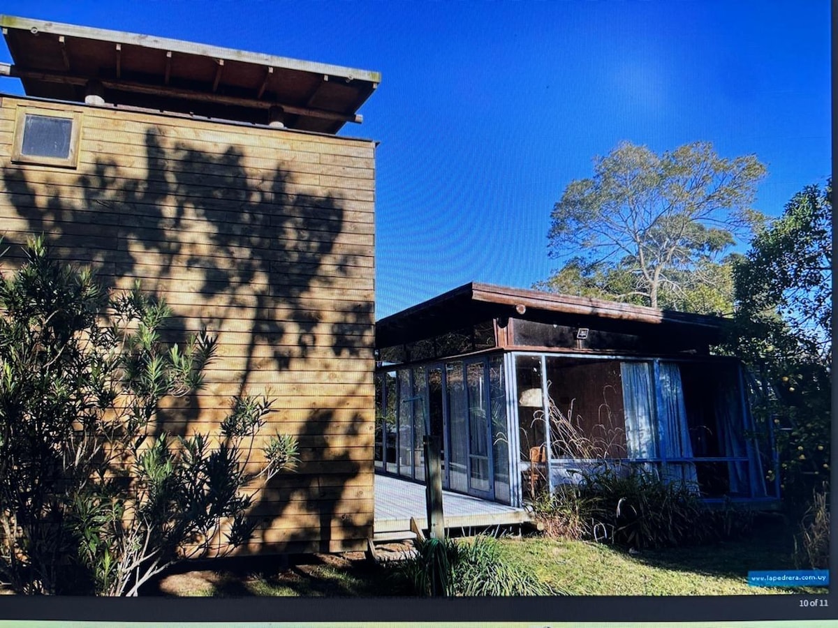 Comoda cabaña, ubicada en una zona muy tranquila, rodeada de árbolesa a 1200mt de la Pedrera y 400 del mar. Ideal para un fin de semana de paz y naturaleza. Cuenta con cama matrimonial en el dormitorio superior y sofa cama abajo. Cocina con horno, Baño con ducha grande Estufa a leña de alto rendimiento. se agradece al retirarse dejar la cabaña en las mismas condiciones de entrega y tirar la basura en el contenedor de la calle.