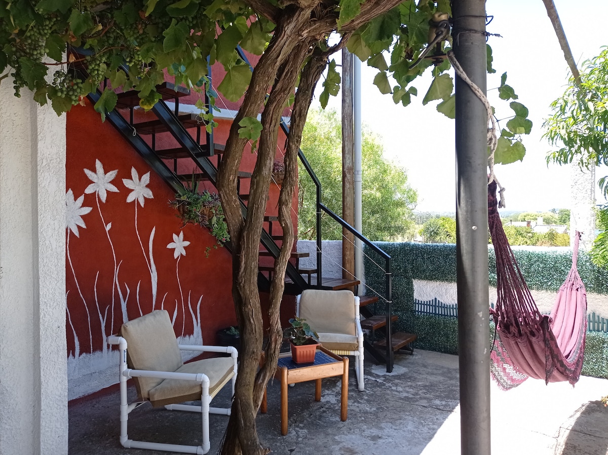 Espacio creado con amor para que disfrutes con comodidad y calma. Ubicado en calle paralela a la ruta y hacia el fondo, no llegan ruidos del tránsito. Entrada independiente. Cochera. Patio sin división pero con zona exclusiva para huéspedes; la anfitriona usa su patio lateral y frontal; garantiza privacidad. Lavarropas compartido Almacén a media cuadra; demás servicios a tres. Acceso a diferentes playas en pocos minutos. Hay una perra muy mansa y dos gatos huidizos con quienes no conocen.