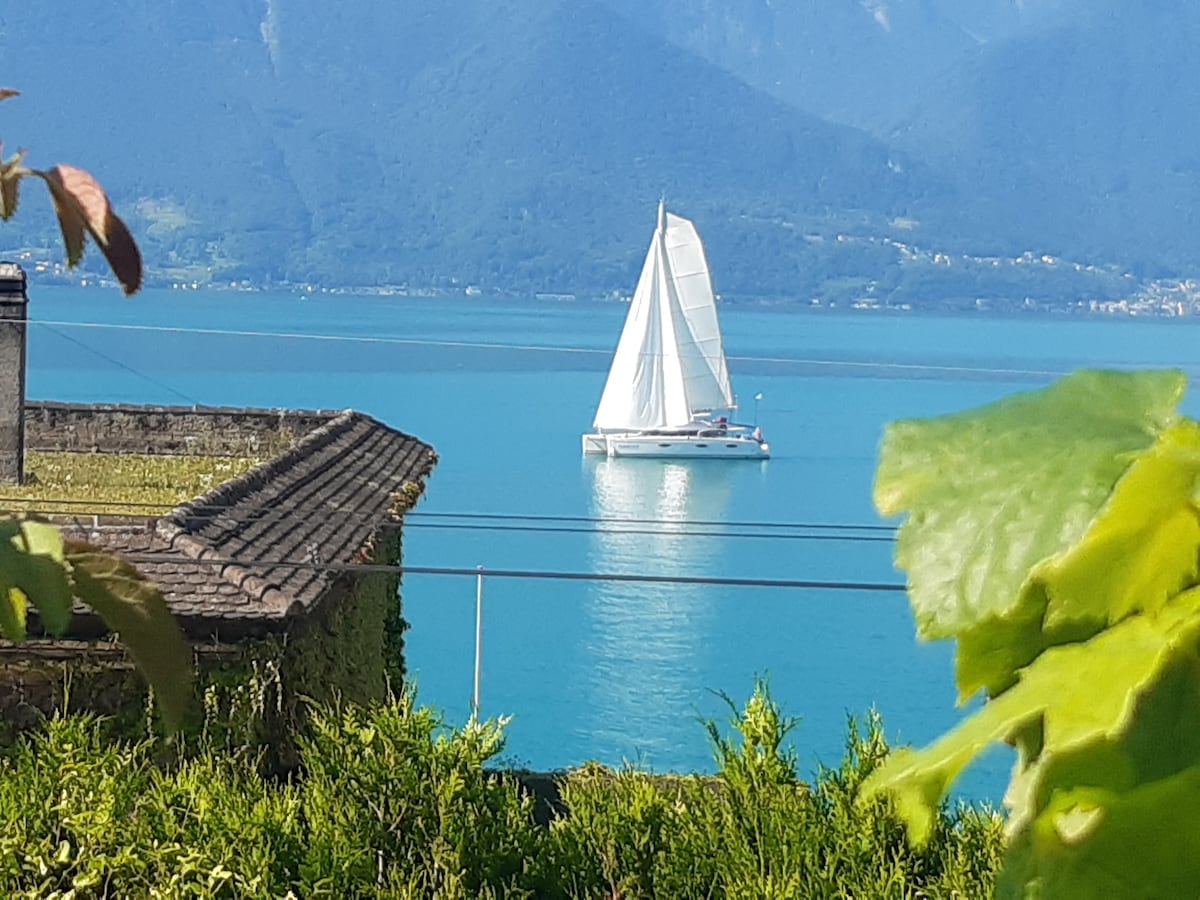 Tout au bord du lac, plage , bourg à 300m, vignoble de Lavaux (patrimoine de L'Unesco), vue imprenable sur les montagnes, grande terrasse aménagée, très bien meublé, tout à disposition, WI-FI, TV, etc.A 5km de Lausanne, 15km de Montreux.