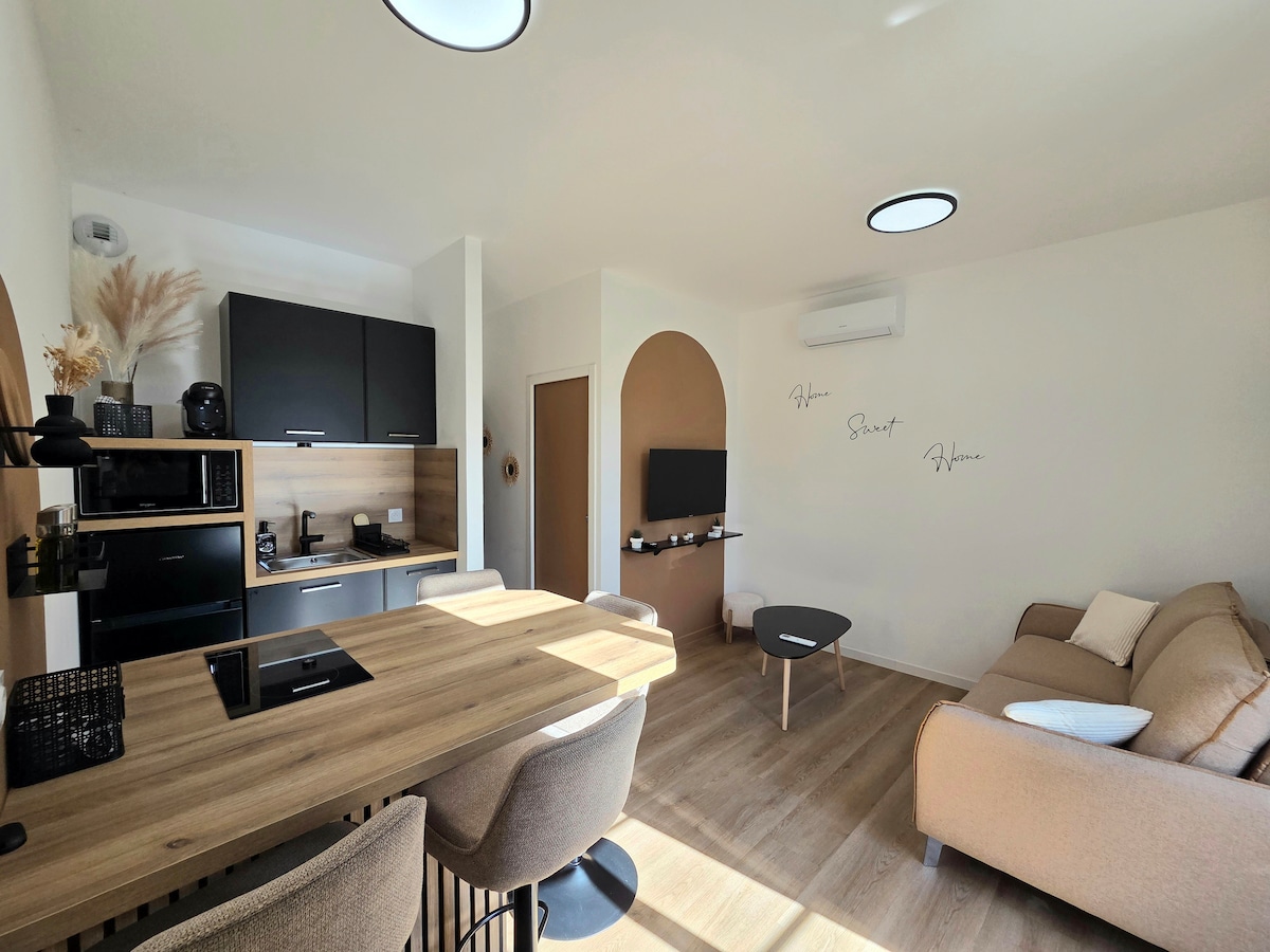 🍭 Goûtez à la douceur de ce petit cocon de 22 m², niché sur l’axe principal de Bourg-lès-Valence, ce studio est élégant, confortable et fonctionnel, il est placé stratégiquement à 200m d'une sortie d'autoroute et à quelques pas de nombreuses commodités. Que vous soyez en déplacement, de passage ou en quête d’une soirée cocooning, ce studio vous accueillera avec bienveillance 🌸 🅿️ Un parking gratuit est disponible à 10 mètres de la porte d‘entrée