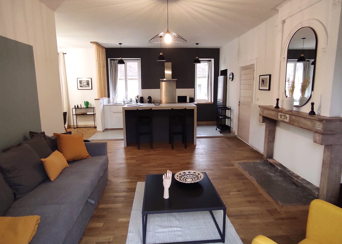 Relax in this quiet, elegant home set in the heart of the hills facing Chateau-Chalon in the village of Voiteur. Entirely built by our own little hands, Le Chaleureux is a wood-frame house designed over a period of several months to offer you a home that's just like us, one in which you'll feel right at home and enjoy our beautiful region to the full. 🏠 Our other homes : >Le Cocon . Gîtes Chez Morgane & Thomas > Domaine GUIET
