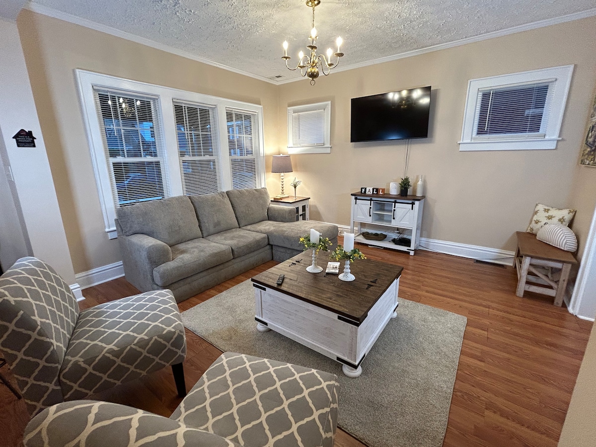 Stay in our stylish, partially remodeled space that combines modern comfort with original character! ‼️Save 10% via non-refundable booking option! ✨Dog friendly fee per pet/night; max of 2 dogs ✨Enjoy new appliances, lighting, HVAC; original flooring and large porch ✨Walk to restaurants & grocery stores; drive just 4 minutes to shopping, the riverfront, and parks ✨Only 7 minutes from Marshall and <10 minutes from hospitals. 1 mile from the Arena and 2 miles from Marshall stadium