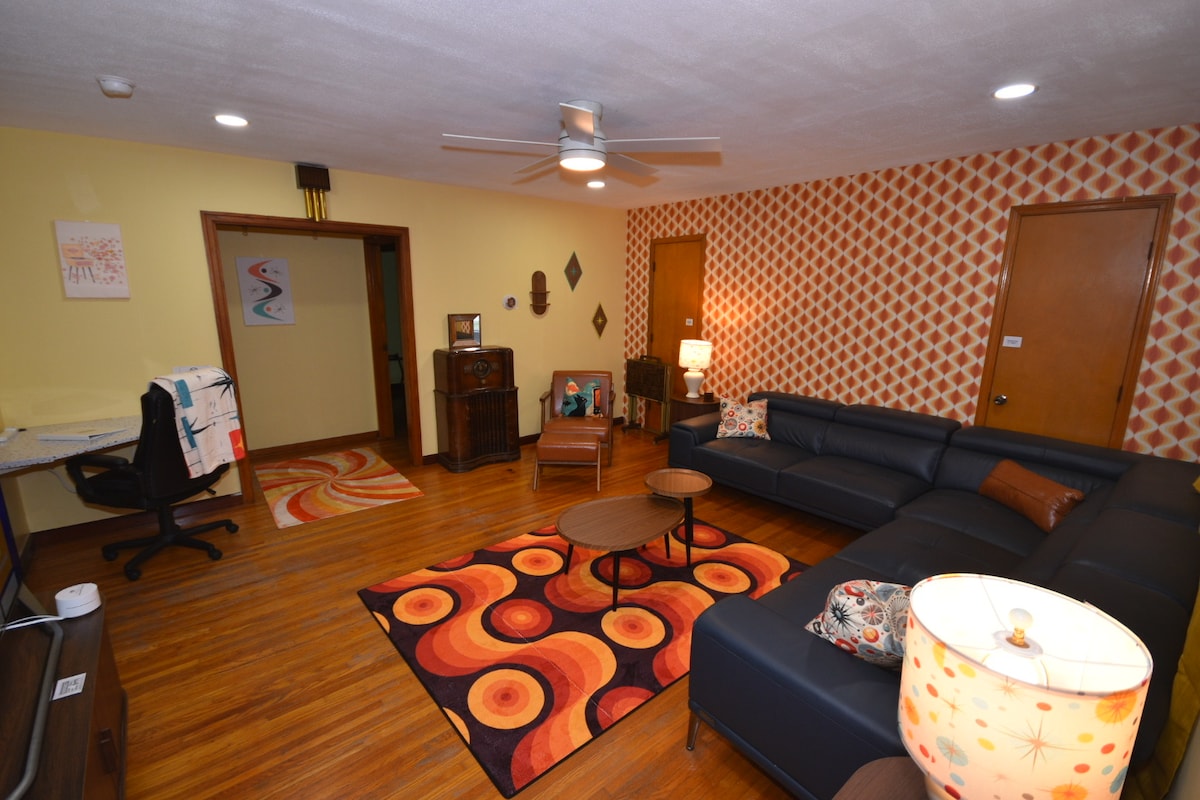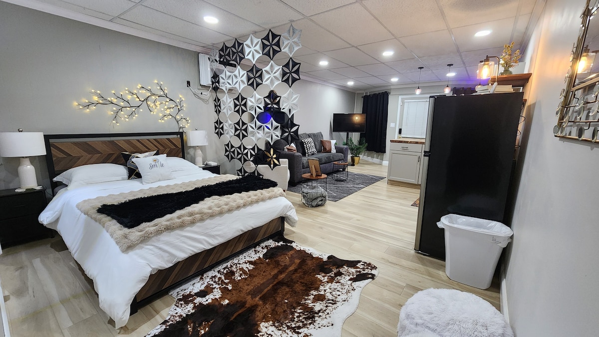 This stylish place to stay is perfect for a couple. Fun styling because who doesn’t feel joy waking up to bright colors?! This space is located on the 2nd floor and has a well stocked kitchen spacious for cooking. Waterfall shower head in the bath/shower combo for amazing relaxation. A12” comfortable queen mattress with tv in bedroom. All surrounded by the stylish living room with a futon couch , chaise lounge large smart TV and an electric fireplace. A shared fire pit outback and fast internet.