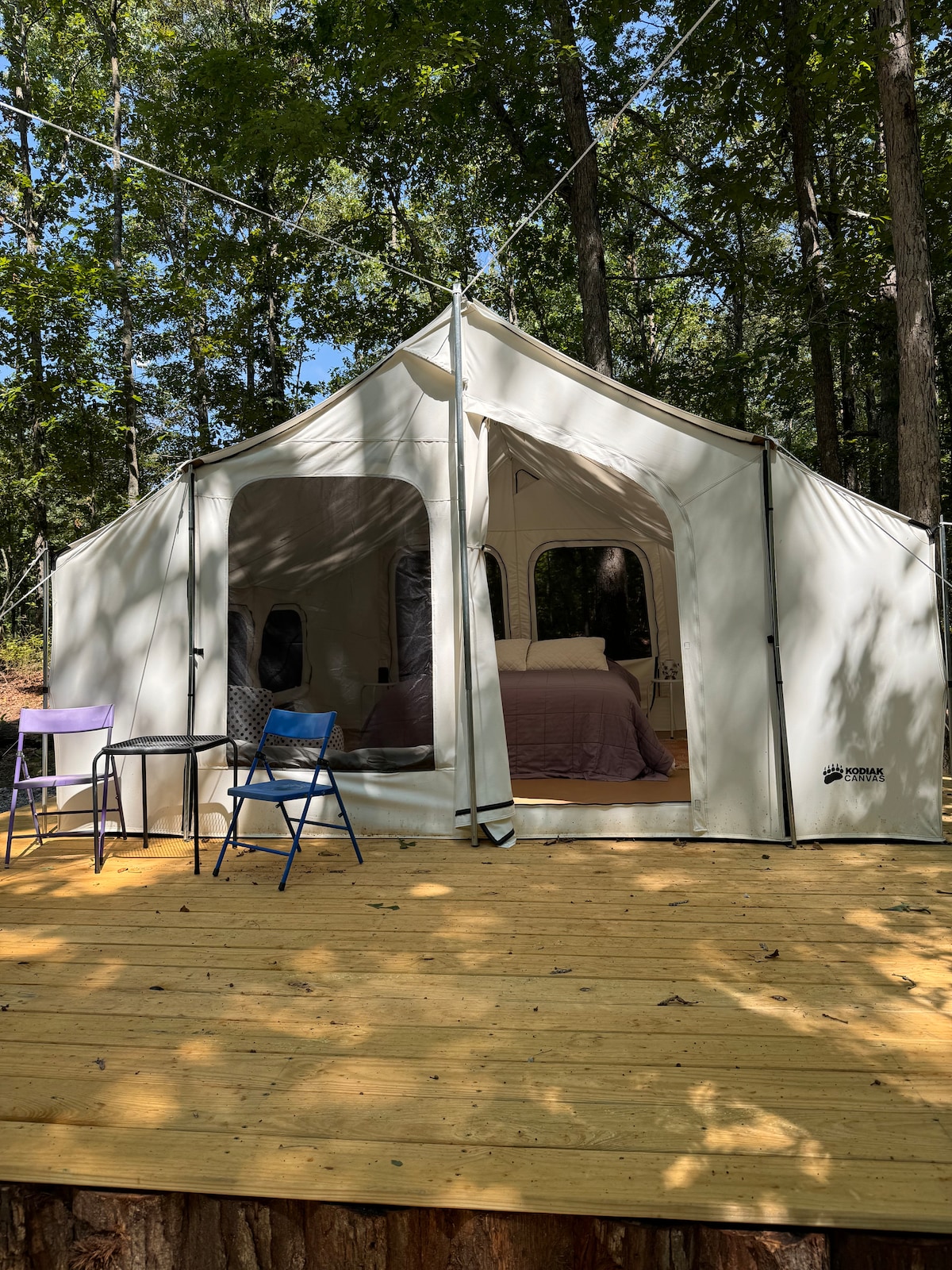 Get away from it all when you stay under the stars! This lovely canvas tent has a comfy queen size bed, tables and chair with ottoman. There’s outdoor seating on the deck, a table and chairs outside and a lovely spot to enjoy an evening fire! We have an outdoor shower and bathroom for your use along with an outdoor kitchen where we are happy to offer coffee and baked goods for breakfast when available! Please let us know if you’d like those in advance. We also just installed solar power!