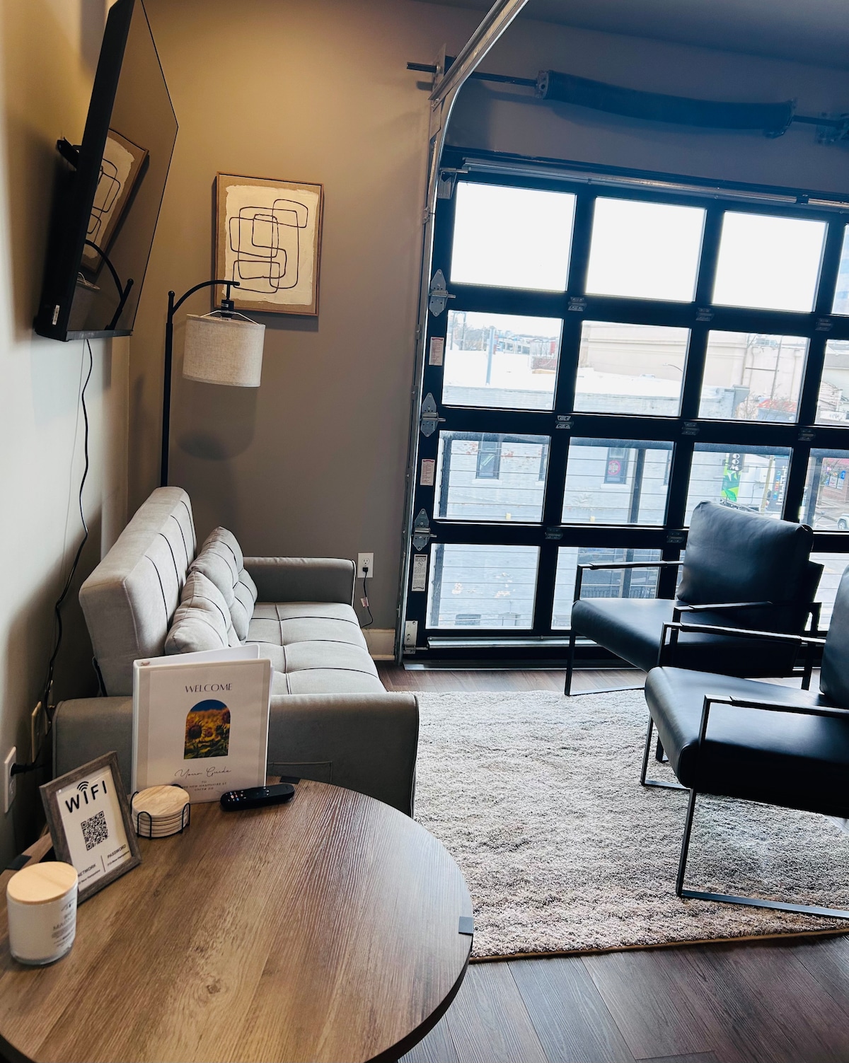Bright and airy 1BR/ 1BA with fold out couch in the Warehouse Arts District above a full restaurant and brewery. Ample free parking, privacy, and amenities along with a 20% discount at Lawrence Beer Company included with your stay. This space is the perfect companion to the Cider Gallery Event space located next door. Book a 2-3 night stay and have a bridal suite to do hair and makeup, bring your gifts and decorations after your reception, and be a 1 minute walk from bed.