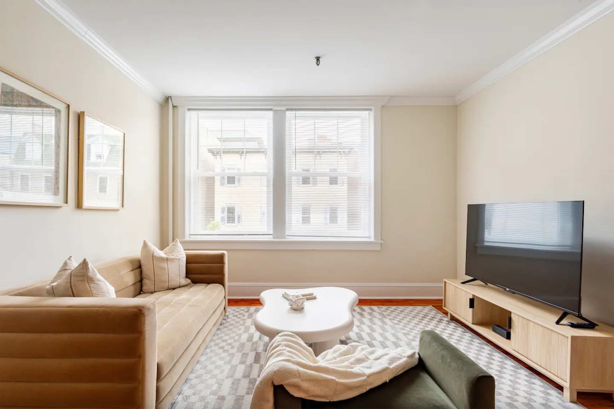 Enjoy this newly renovated Chestnut Hill apartment, ideal for long stays. This two-story retreat features two spacious bedrooms and a full bathroom with a standing shower upstairs. Downstairs, you'll find a powder room, a fully equipped kitchen, and a cozy living room. Each bedroom offers a queen-sized bed with ample closet space for your storage needs. The kitchen is fully equipped with a gas range/oven, microwave, dishwasher, and a refrigerator with a water and ice dispenser. Start your day w