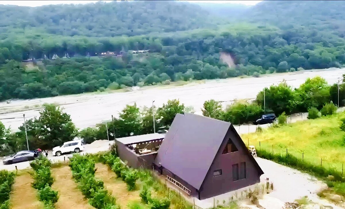 Это стильное жилье идеально подходит для групп, семей до 6-7 человек, со всеми удобствами, комфортом в сегменте люкс. Дом находится в тихой, зеленой зоне, на берегу реки с видом на горы, лес, реки.
