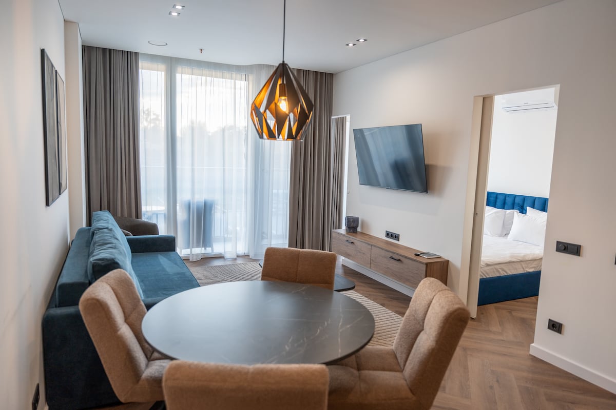 This modern apartment, located in the centre of Druskininkai has a balcony with a garden view, free WiFi, flat-screen TV, books, fully equipped kitchen, coffee machine with complimentary capsules, dishwasher, hair dryer, washing machine. Towels, bed linens and free toiletries are provided. Property is within a short walking distance from nature parks, cycling paths, restaurants and spa centres. 3 min. walk to musical fountain, 5 min. to AquaPark, 4min. to Druskonis lake, 10min. to the beach.
