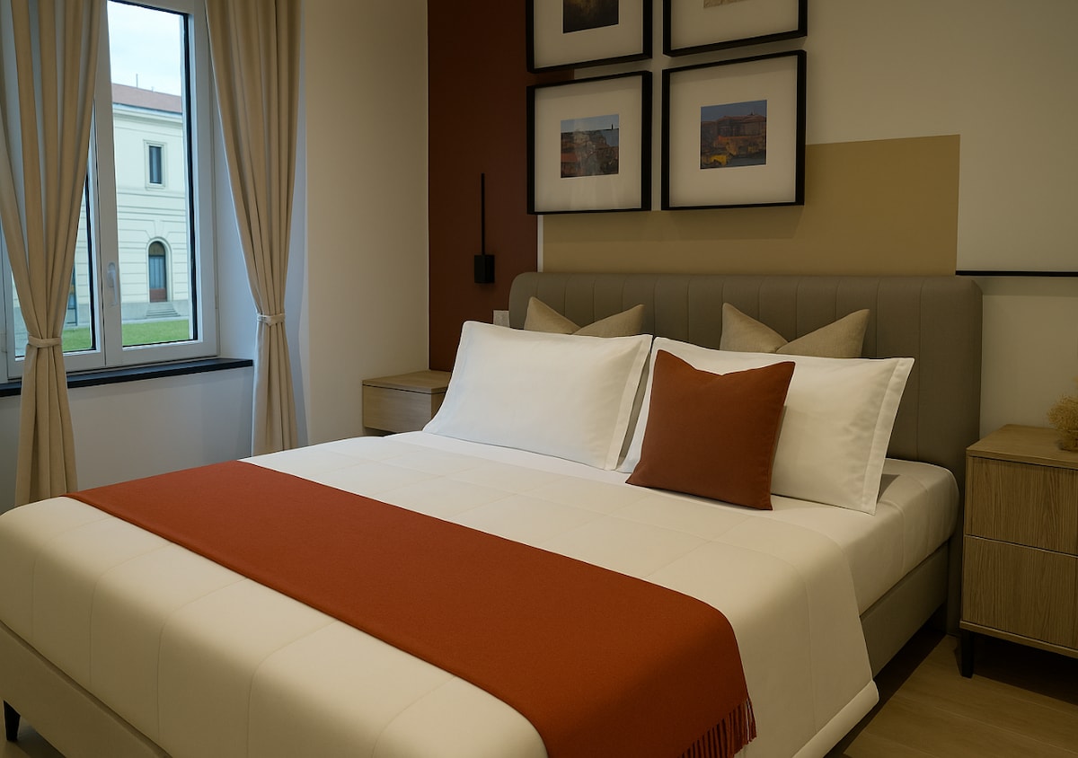 Stunning renewed apartament, two mins walking from La Spezia train station, the ideal location to reach Cinque Terre. The apartment is located at the higher level of a modern building in the main street in town (5 mins walking from the pedestrian area). One big bedrooom with a bed king size for 2 people, one private bathroom, furnished kitchen, a big living room with sofabed (for 2 people), TV, wifi and stereo system. It's also available a cot and an high chair for a baby. No air condition.