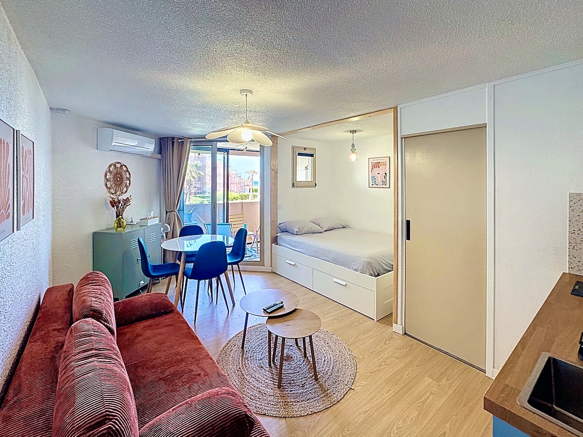 Appartement standing sur la marine avec vue canigou coucher du soleil pour 4 personnes climatisé 1 chambre avec lit en 160 et placard 1 chambre avec canapé lit en 140 de qualité et placard cuisine équipée avec îlot central tous les ustensiles pour cuisiner,cafetière nespresso, grille pain... deux grandes baies vitrées donnent sur une grande terrasse équipée avec store banne tout commerce a 50 mètres, piscine collective, tennis, city stade places de parking privée location du samedi au samedi