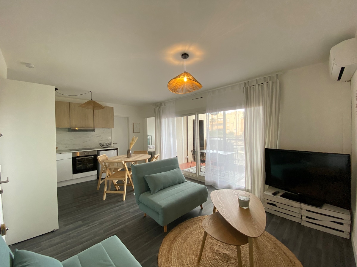 Au rez-de-chaussée d'une résidence arborée, ce joli appartement rénové dispose d'une terrasse privative de 10 m², permettant de prendre vos repas à l'extérieur et de sécuriser vos vélos. La plage du Lydia et ses commerces sont aux abords immédiats de la résidence, la place du Tertre et ses restaurants sont tout proches ainsi que la Pinède pour une balade à l'ombre. Place de parking privative. Wifi inclus, TV connectée. Serviettes, draps et linge de maison non inclus.