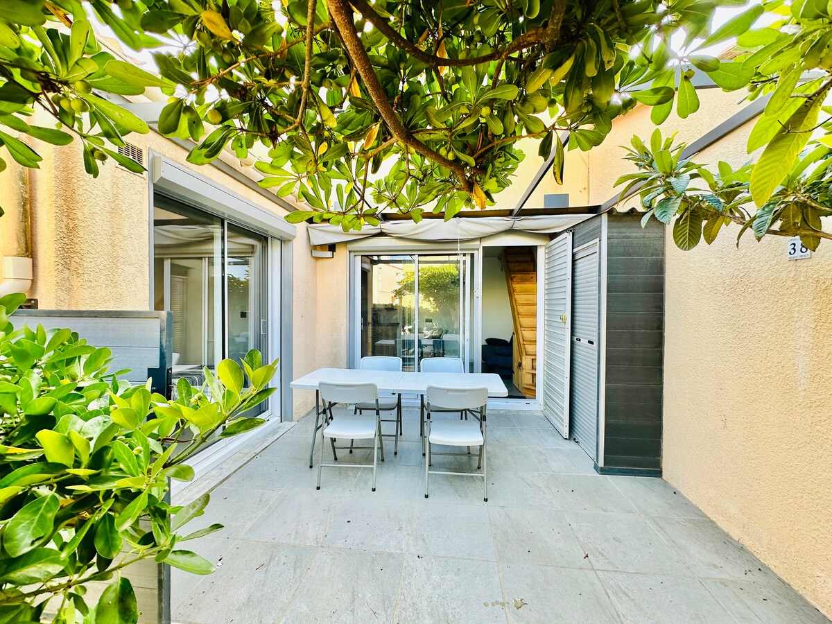 Au rez-de-chaussée d'une résidence arborée, ce joli appartement rénové dispose d'une terrasse privative de 10 m², permettant de prendre vos repas à l'extérieur et de sécuriser vos vélos. La plage du Lydia et ses commerces sont aux abords immédiats de la résidence, la place du Tertre et ses restaurants sont tout proches ainsi que la Pinède pour une balade à l'ombre. Place de parking privative. Wifi inclus, TV connectée. Serviettes, draps et linge de maison non inclus.