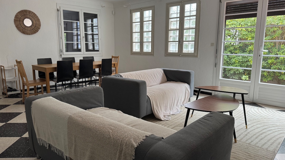 Appartement duplex situé entre la gare et le centre avec jardin et piscine privée séjour cuisine fermée, deux chambres, une grande salle de bain et une salle d'eau avec deux toilettes. La salle de bain dispose d'une baignoire balnéo pour deux personnes et d'un coin détente avec fauteuil chauffant et massant. Vous aurez accès a un jardin privé avec jacuzzi extérieur, un espace pour manger dehors avec piscine privé. Un emplacement pour garer plusieurs voitures est juste devant l'appartement.