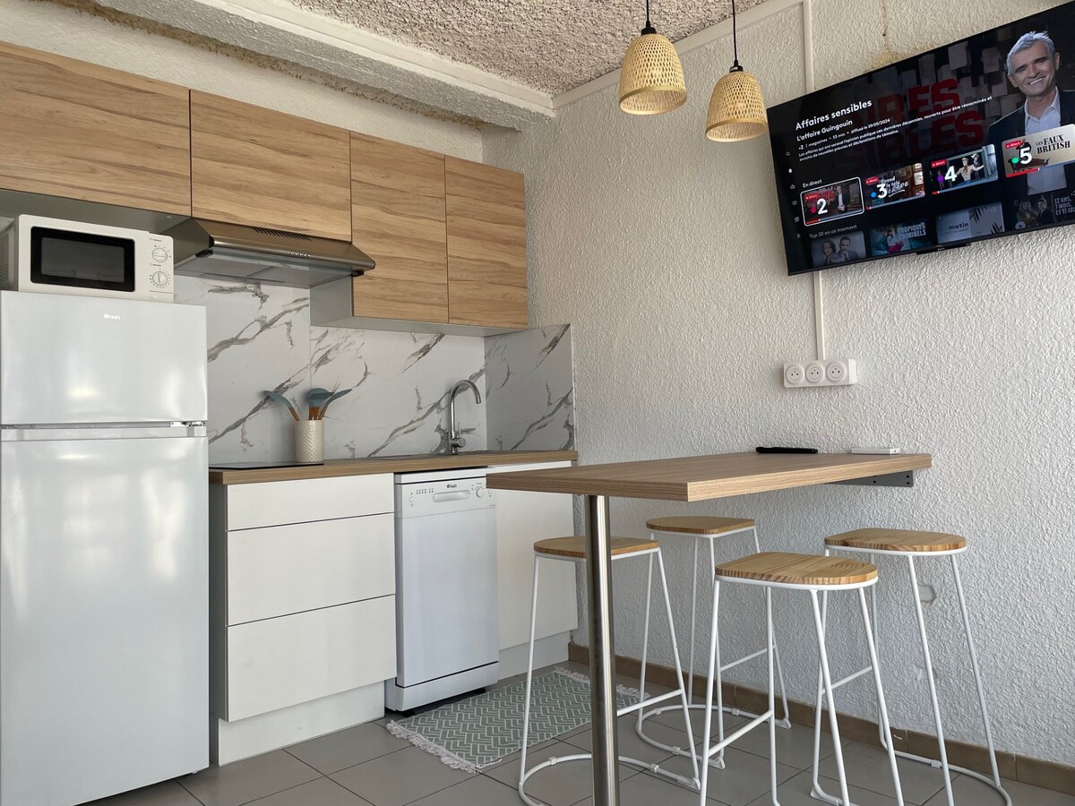 Charmant petit studio indépendant dans le centre du village de Torreilles, près de tous les commerces de proximité : boulangerie, boucherie , épicerie , tabac/journaux et de restaurants réputés : l’Artichaut , la Maison Secall, le Bistroquet , le Régent , Pizza Romane . La salle de bains à été refaite dernièrement et la climatisation installée .