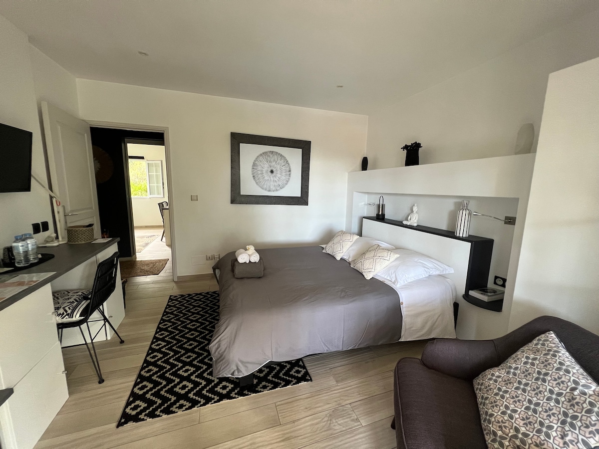 Coquet appart. T2 meublé très lumineux en R+1 avec 1 chambre-salon de 14 m², cuisine équipée, salle de bain WC séparé. Terrasse privative de 30 m² ombragée pour vos repas et sunset vue mer. Wifi, télévision. Entrée indépendante sur propriété de 1600 m². Très calme et recherché à mi-hauteur entre mer et montagne, proche toutes commodités. Location à la semaine, quinzaine ou maximum 1 mois consécutif.